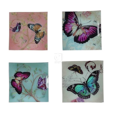 The Detailed Description of ART GLASS SET OF 4 BUTTERFLY SQUARE PLATESFeatures